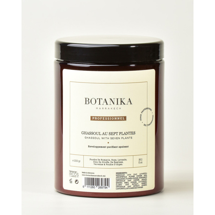 Ghassoul with Seven Plants from Botanika Marrakech is a natural mineral clay rich in benefits for hair and body care. Used for centuries by Moroccan women, it deeply cleanses while removing impurities. Enriched with extracts from seven carefully selected plants, this natural Ghassoul purifies, soothes the skin, and reveals its natural glow.